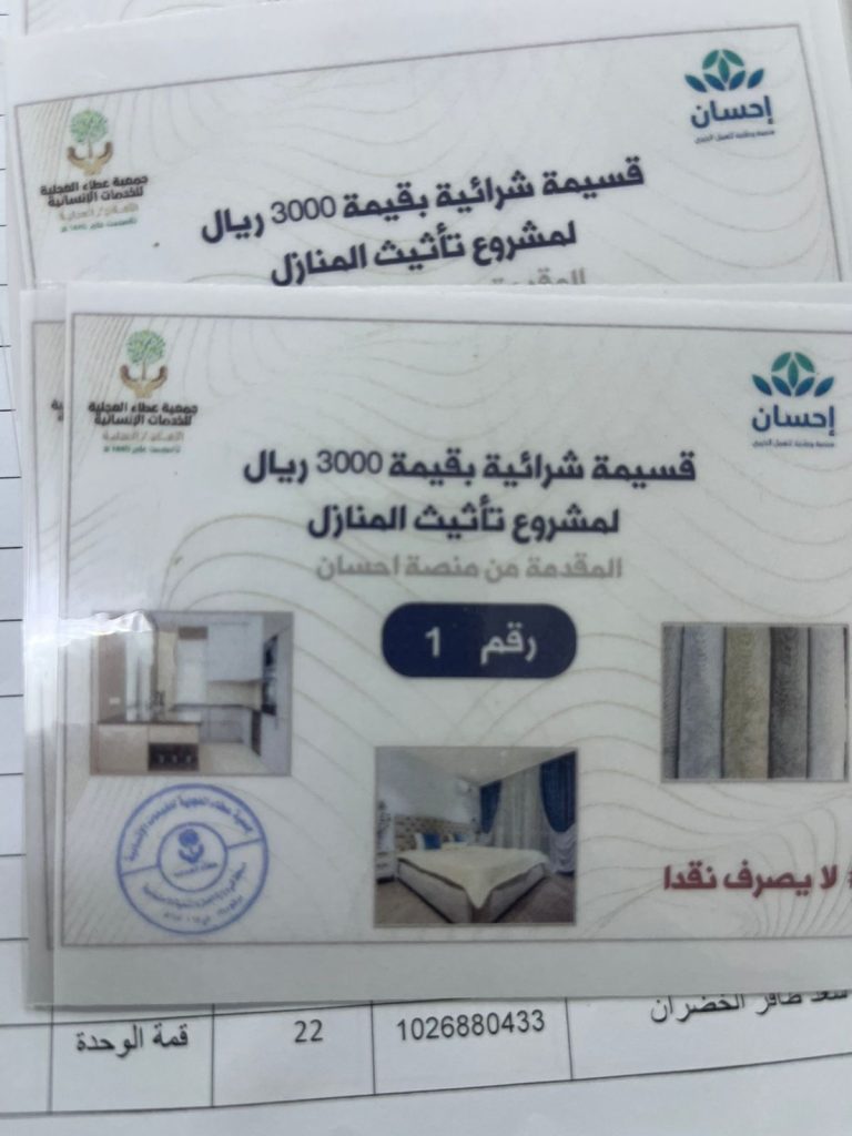 تم في هذا اليوم البدء في تنفيذ مشروع تأثيث المنازل وذلك بتوزيع بطاقة مشتريات أثاث منزلي للمستفيدين ، بدعم من منصة إحسان .